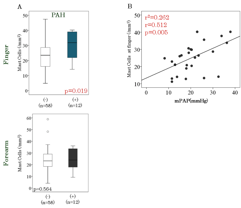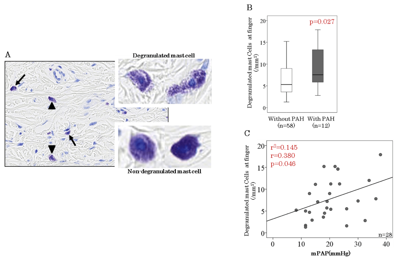 手指真皮マスト細胞は, PAH合併で有意に多く, 更にPAHの病勢を反映していた