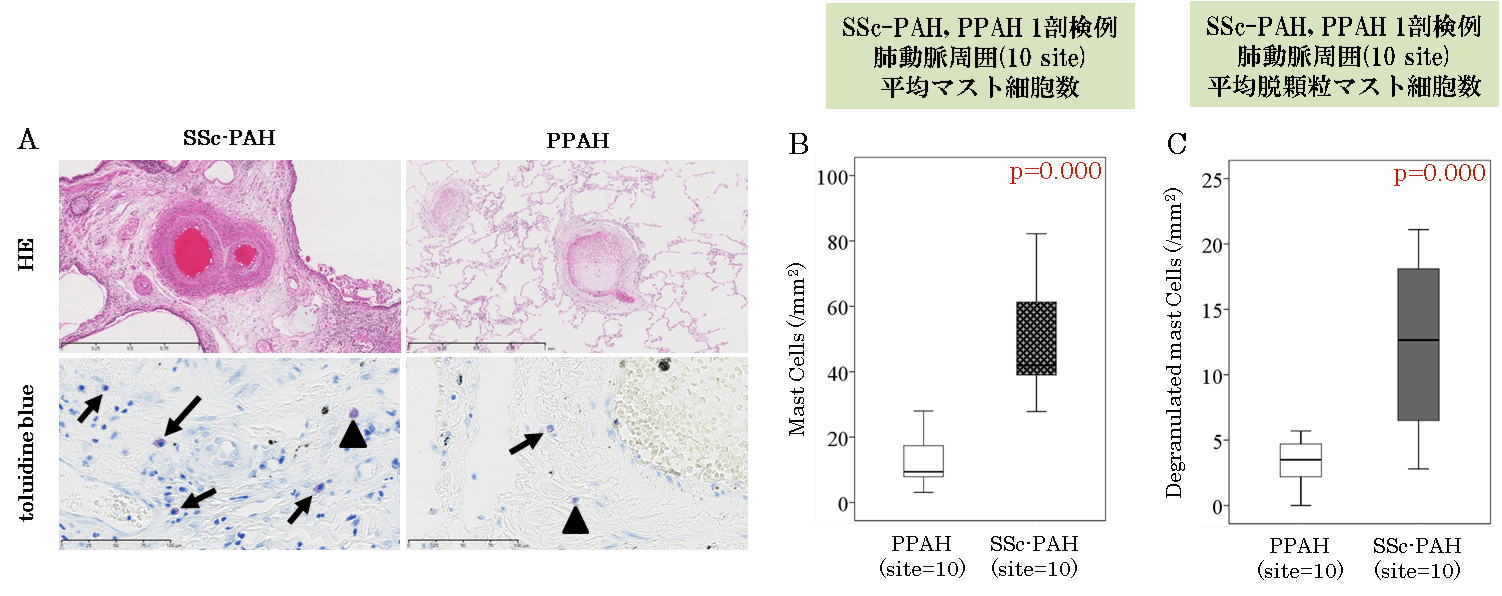 SSc関連PAH肺組織では, 肺動脈周囲には多数のマスト細胞が存在し, 盛んな脱顆粒を認めた
